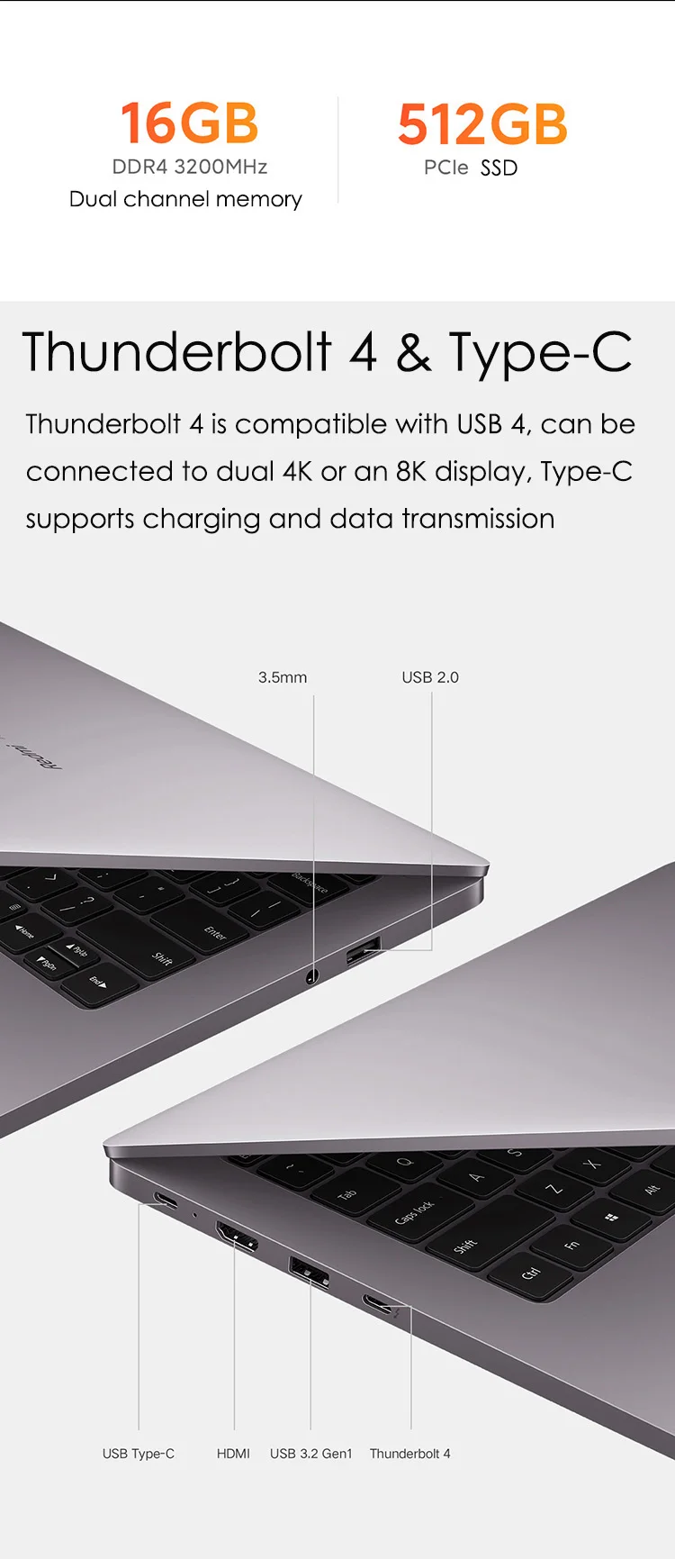 • Port: Thunderbolt 4,1×USB 3.2 Gen2,3.5 mm Combo Audio Jack,1*USB2.0,HDMI-Compatible