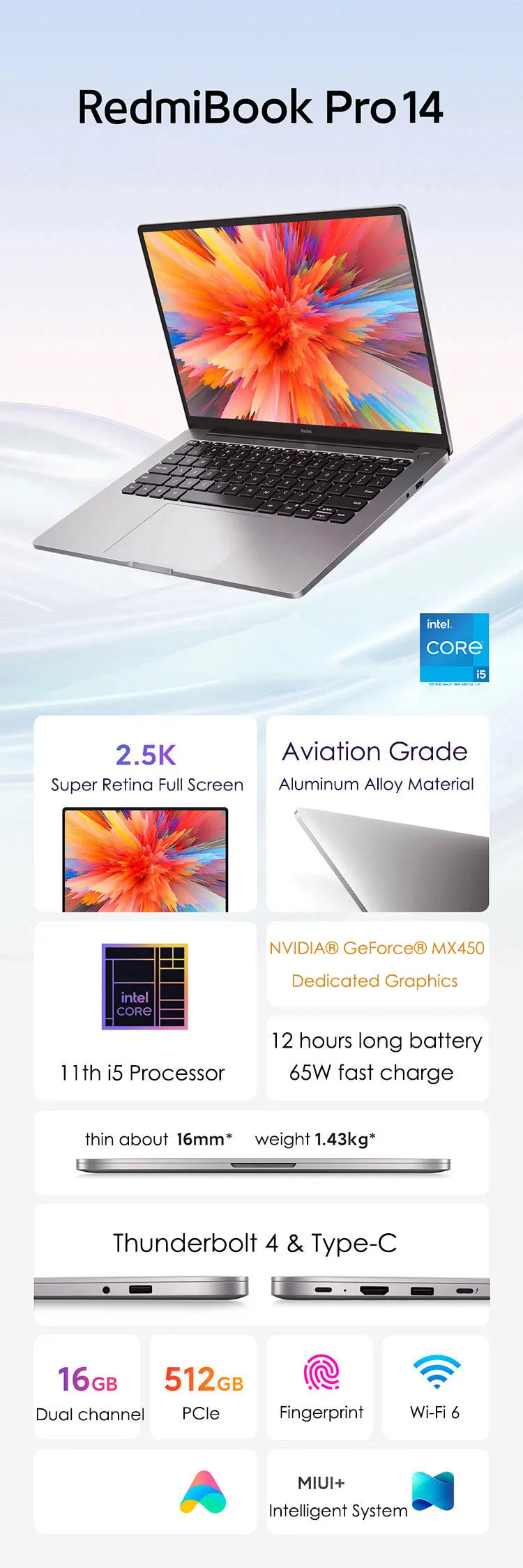 Xiaomi Redmibook Pro 14 Laptop 14 Inch Ultra Thin And Light Office Netbook i5-11320H 16GB 512GB With NVIDIA MX450 Graphics Card