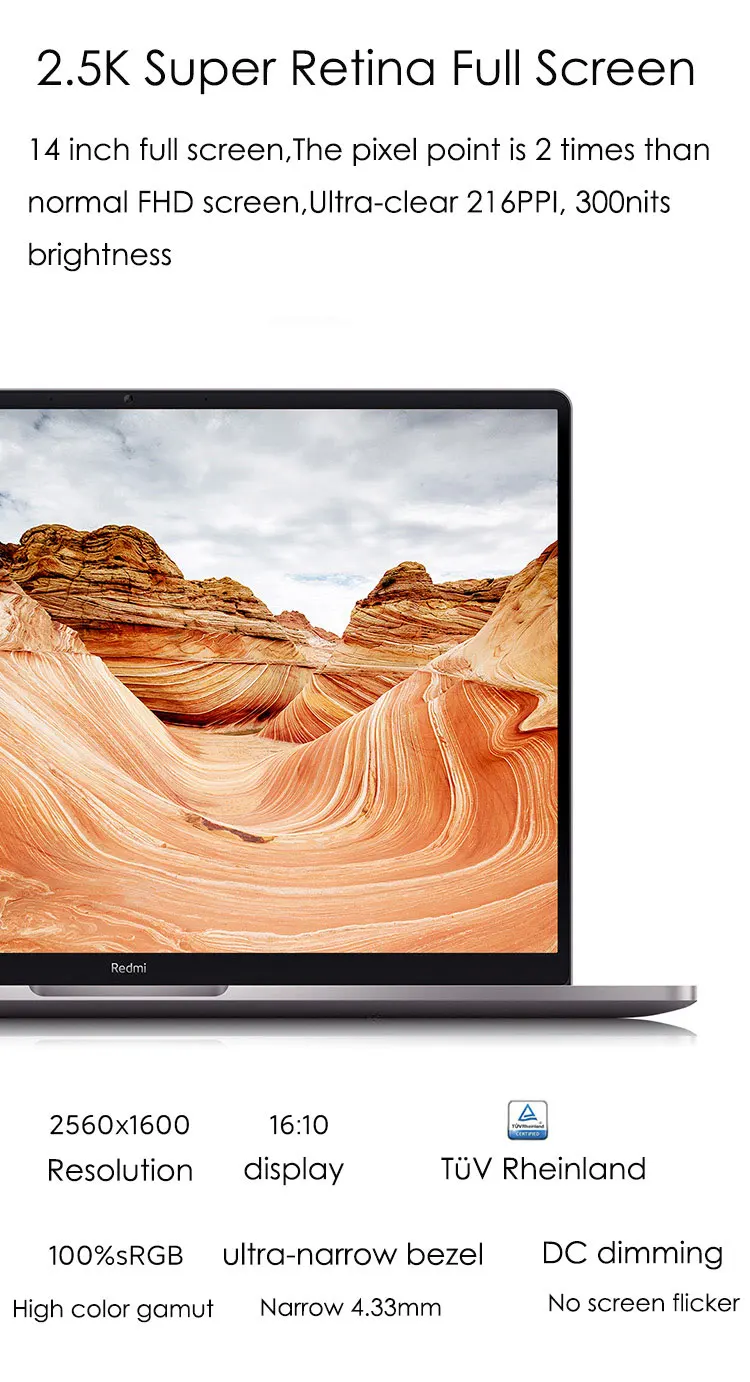 14″ Super Retina Full screen (2560*1600) 16:10;4.3mm narrow bezel, 88.2% screen ratio, high-definition anti-glare hard screen, 178° wide viewing angle, 300nits brightness, 1000:1 contrast ratio, 100% sRGB color gamut, DC dimming, TÜV Rheinland low blue light certification